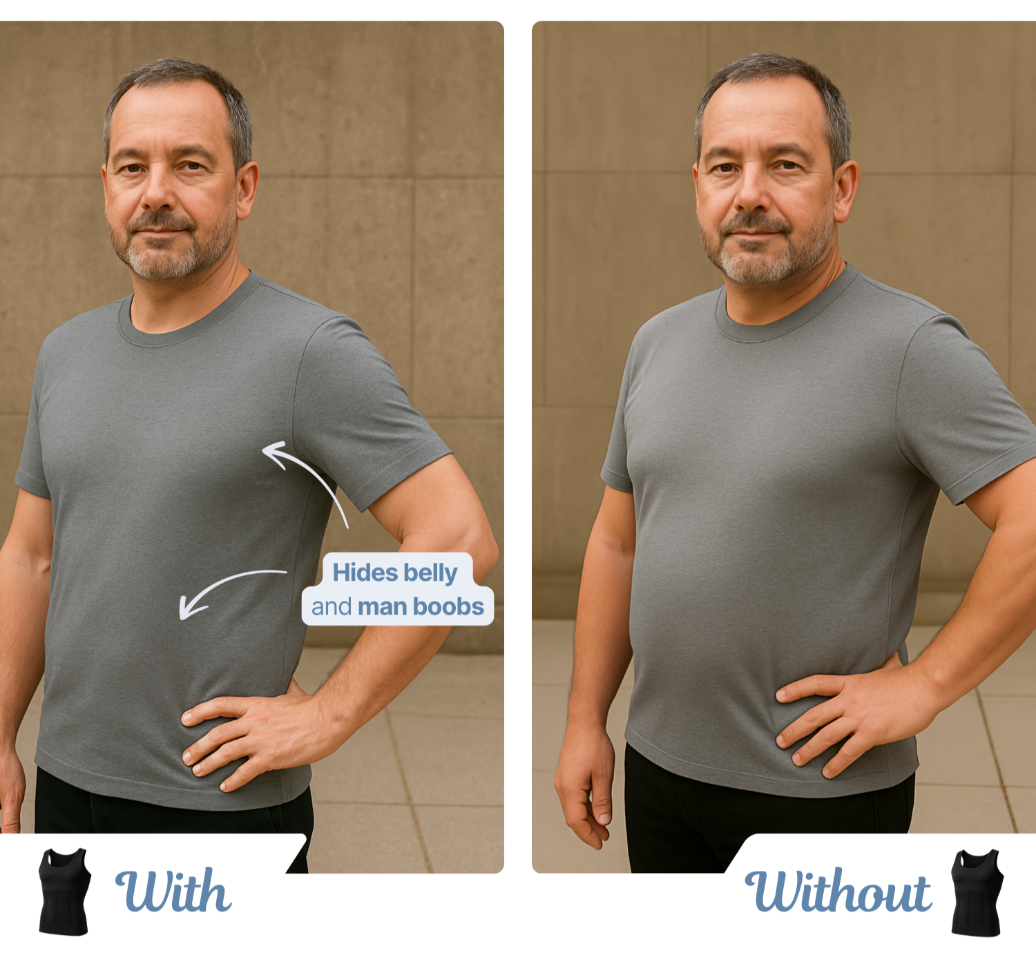 My tank tops are designed for men who want to feel instantly confident – without the hassle. Whether you want to hide your belly, make your nipples less visible, or simply look sharper in your clothes, Tom’s Tanky™ gives you a slimmer look in seconds.